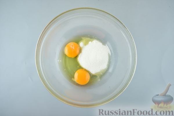 В глубокой миске соединить яйца, сахар и ванилин (или ванильный сахар).