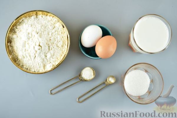 Продукты (на 4 порции) Молоко — 200 мл Яйца — 2 шт. Сахар — 80 г Мука пшеничная — 240 г (1,5 стакана объёмом 250 мл) Разрыхлитель — 7 г Ванилин — 1 щепотка или ванильный сахар — 1-2 ч. ложки