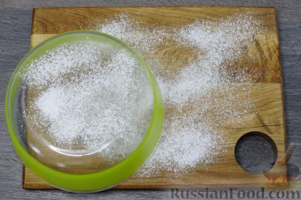 Заранее подготовьте кухонную доску или ровный металлический противень. Возьмите миску с плоским дном. В моём случае это стеклянный салатник с диаметром дна 10 см. Доску/противень и наружную сторону салатника припылите сахарной пудрой, используя мелкое ситечко.