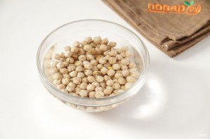 Сухой нут промойте, залейте водой и оставьте на 12 часов. Можно даже оставить на ночь.