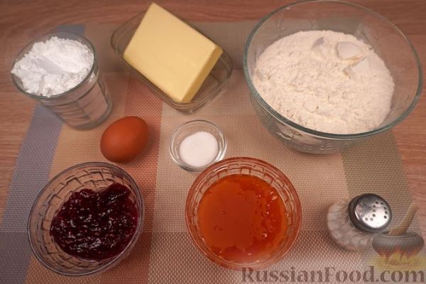 Продукты (на 10 порций) Масло сливочное — 200 г Сахарная пудра — 120 г + 20 г для декора Яйцо — 1 шт. Мука — 350 г + 20 г для подпыла Сахар ванильный — 8 г Соль — 1 щепотка Джем абрикосовый — 100 г Джем малиновый — 100 г