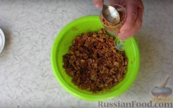 Перемешиваем кукурузные хлопья, измельченные орехи и вареное сгущенное молоко.