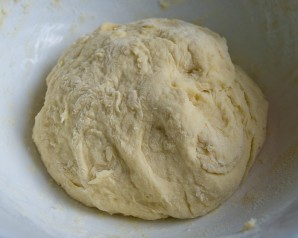 Для начала мы приготовим тесто: в подогретое молоко мы всыпаем сухие дрожжи и немного соли, перемешиваем. Теперь взбиваем яйцо и вливаем к нему 2 столовые ложки растопленного сливочного масла, перемешиваем, соединяем эту смесь с молочно-дрожжевой и начинаем добавлять муку. Нам необходимо замесить тесто так, чтобы оно было довольно крутым и эластичным. Готовое тесто ставим на 1,5 часика "отдохнуть", накрыв салфеткой.