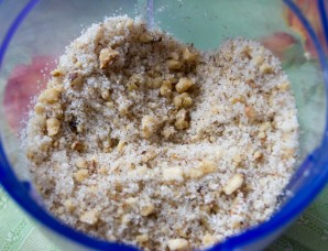 Теперь перейдем к орехам: пол стакана орехов мы оставляем для украшения, а остальные слегка поджариваем на сковороде (без масла) в течение 3-5 минут. Далее орехи следует измельчить в крошку и смешать со стаканом сахара и ванилином.