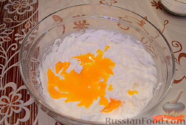 Смешать силиконовой лопаткой белки с желтками, до однородной консистенции.