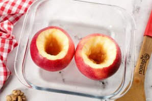 В первую очередь вымойте яблоки. Очень аккуратно вырежьте сердцевину, чтобы не проткнуть дно и стенки. Для этого лучше использовать нож с коротким лезвием. Сначала вырежьте небольшой конус, затем ножом или чайной ложкой вычистите остатки семенной коробочки. Яблоки выложите в глубокую тарелку или форму, пригодную для запекания в микроволновой печи.
