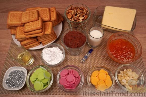 Продукты (на 15 порций) Печенье песочное — 400 г Масло сливочное размягчённое — 200 г Орехи грецкие — 100 г Какао-порошок — 40 г Молоко — 40 г Варенье абрикосовое — 120 г Ромовый ароматизатор — 2 г (по желанию) Сахарная пудра — 25 г * Для декора: Шоколад белый — 35 г Глазурь розовая — 35 г Глазурь лайм — 35 г Глазурь жёлтая — 35 г Посыпка жемчуг — по желанию Масло растительное — 20 г