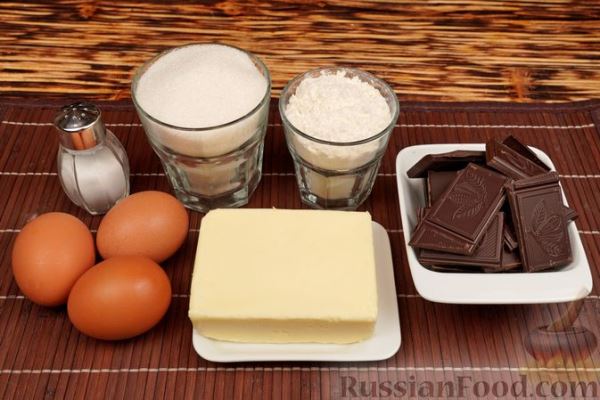 Продукты Шоколад тёмный – 180 г Масло сливочное – 180 г Сахар – 220 г Яйца – 3 шт. Мука – 75 г Соль – 1/4 ч. ложки