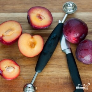 Сливы разрезаем пополам, удаляем косточки.
