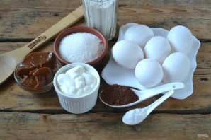 Добавьте какао и сначала 1 стакан муки, взбейте миксером. Затем всыпьте оставшуюся муку и снова взбейте миксером.