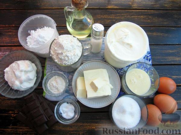 Продукты (на 10 порций) Бисквит: Яйца — 3 шт. Сахар — 100 г Мука — 130-150 г Разрыхлитель — 18 г Сметана густая — 120 г Молоко сгущённое- 60 г Соль — 0,3 ч. ложки * Сметанный крем: Масло сливочное — 150 г Сыр сливочный — 150 г Сахарная пудра — 135 г Сахар ванильный — 1 ч. ложка Сметана густая 25-30% — 420 г * Шоколадная глазурь: Шоколад чёрный или молочный — 150 г Масло растительное рафинированное — 30 мл * Кокосовая стружка — 2 ч. ложки для украшения (по желанию)
