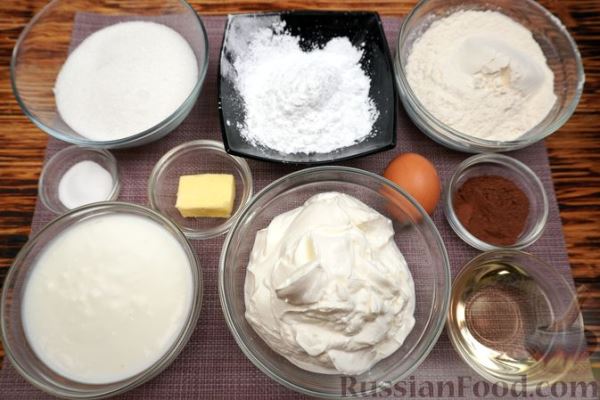 Продукты Мука — 1 стакан 200 мл (130 г) Сахар — 1 стакан (180 г) Кефир — 1 стакан (200 мл) Яйцо — 1 шт. Сода — 8 г (1 ч. ложка) Масло растительное — 3 ст. ложки Какао-порошок — 1 ст. ложка Масло сливочное для смазывания формы — 10 г * Для крема торта: Сметана жирностью не менее 20 % — 400 г Сахарная пудра — 4 ст. ложки