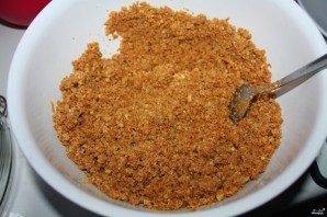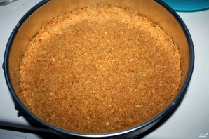 Сливочное масло хорошенько перемешайте с крошкой. В форму под торт выложите пергаментную бумагу (вырежьте по диаметру формы). Плотно утрамбовывая, выложите в форму крошку печенья, отправьте форму в холодильник для застывания основы.