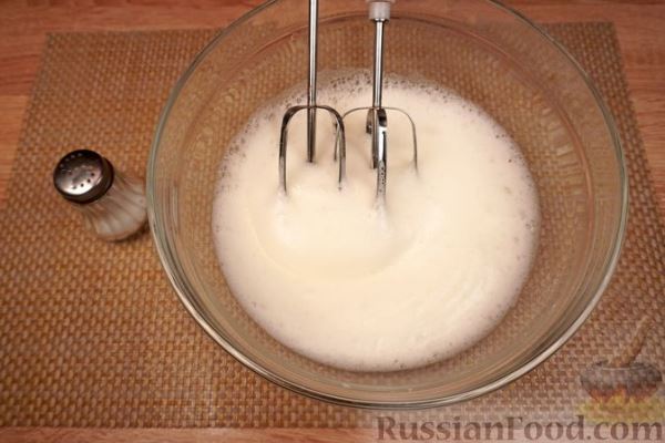 Взбить всё на высоких оборотах миксера 4 минуты, пока белки не загустеют. Миску накрыть пищевой плёнкой, убрать в холодильник.