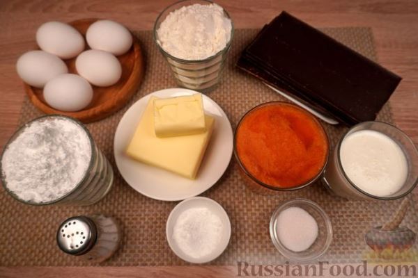 Продукты (на 8 порций) Для теста: Мука — 150 г Сахарная пудра — 130 г Яйца — 5 шт. Шоколад чёрный — 200 г Масло сливочное размягчённое — 150 г Сахар ванильный — 8 г Разрыхлитель — 10 г Соль — 1/8 ч. ложки * Джем абрикосовый — 350 г Шоколад тёмный — 150 г Сливки жирностью 33% — 100 г * Для формы: Масло сливочное — 10 г Мука — 20 г