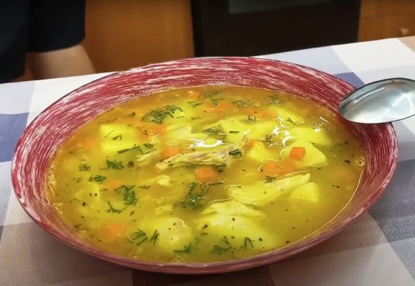 Добавляем в суп измельченный чеснок и куриное мясо. Варим суп до готовности картофеля.
