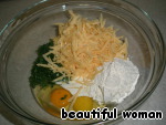 Выкладываем все продукты сразу: натертый сыр, два яйца, сметану, нашинкованую зелень укропа и две столовые ложки с большой горкой муки.