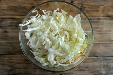 Подготовьте необходимые ингредиенты. Белокочанную капусту для квашения лучше использовать поздних сортов, у такой капусты должны быть плотные, тугие кочаны, без зеленых вкраплений на листьях. Капусту очистите от верхних грязных, сухих листьев и тонко нашинкуйте.