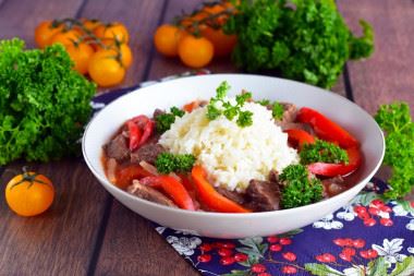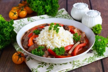 В глубокую тарелку выложите рассыпчатый рис и полейте его мясной подливкой. Приятного аппетита!