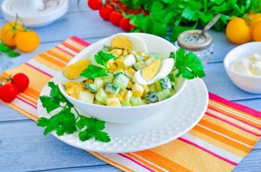 Самый бюджетный, простой и быстрый, на скорую руку! Салат из огурца, яиц и кукурузы содержит минимум ингредиентов, но, тем не менее, получается вкусным и сытным. Он отлично подойдет для быстрого перекуса, особенно если яйца будут отварены заранее. Заправлять салат можно как майонезом, так и сметаной.