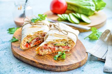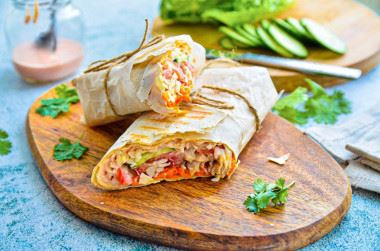 Не перегружайте лаваш начинкой, иначе его будет невозможно аккуратно свернуть и он порвется при обжарке.