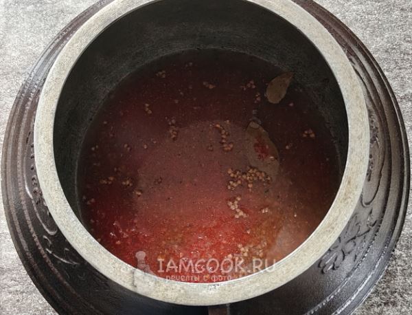 В казан положить промытую крупу, залить водой, добавить томат, соль, перец, кориандр и лавр.
