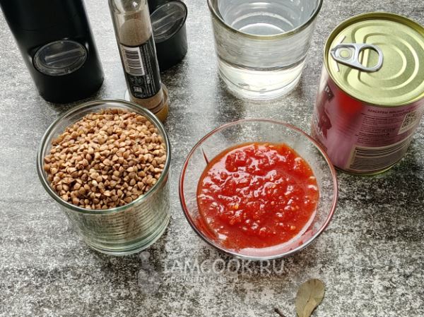 Для приготовления гречки с тушенкой в афганском казане я взяла свиную тушенку, подойдет и говяжья. Томат у меня из домашних заготовок, можно взять свежий помидор, ошпарить кипятком, снять кожицу и измельчить.