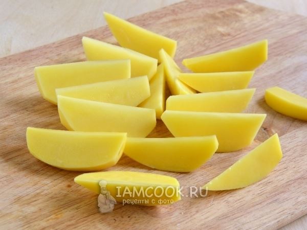 Картофель вымойте, очистите и нарежьте ломтиками-лодочками.