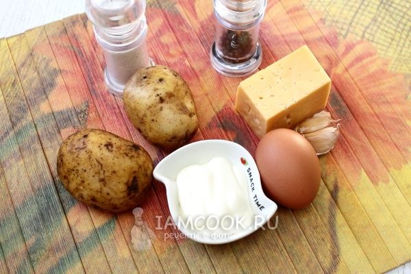 Подготовьте для запеканки продукты по списку: картофель, сыр, яйца, майонез и специи.