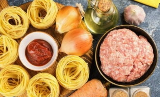 Как приготовить макаронные гнезда с фаршем на сковороде? Размораживаем фарш, вынимаем макароны из упаковки, очищаем и промываем овощи.