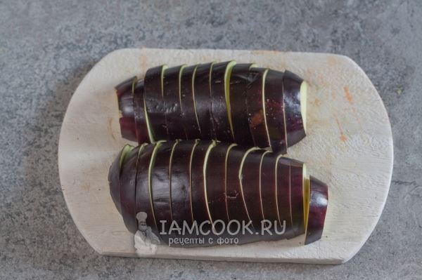 Баклажан режем на половины вдоль, а потом — шайбами с толщиной около 1 см.