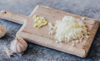 Паста болоньезе легко готовится по классическому рецепту в домашних условиях. Мелко рубим репчатый лук и чеснок.