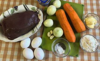 Как приготовить классический печеночный торт из говяжьей печени? Для удобства подготовим нужные продукты, отмерим их количество.