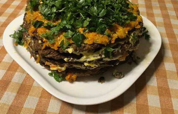 - Печеночный торт из говяжьей печени с морковью и луком