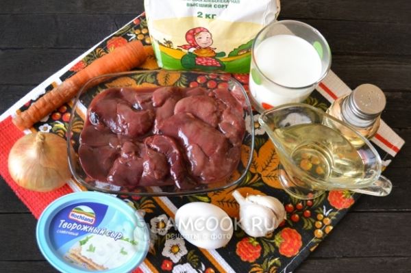 Блины приготовим из охлажденной куриной печени. В качестве начинки будем использовать мягкий творожный сыр с обжаркой из моркови с луком и чесноком.