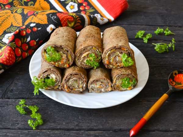 Домашний рецепт приготовления рулетов из печеночных блинчиков с начинкой. Блинное тесто готовится из куриной печени.