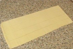 Сосиски в тесте в духовке приготовить очень просто. Тесто необходимо подготовить к разделке. Если оно находилось в морозилке, разморозить при комнатной температуре. Снять аккуратно упаковку и, прежде чем разложить на рабочую поверхность, посыпать ее мукой. После выложить пласт и разрезать его на полосы, их ширина должна быть в пределах 3-4 см.
