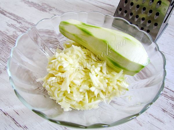 Кабачки вымойте, срежьте кожицу и натрите на крупной терке.