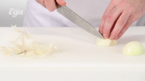 3 Мелко-мелко режем лук и жарим его до тех пор, пока он не станет прозрачным и не начнет золотиться.