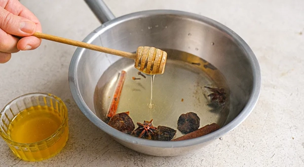 Подготовьте ингредиенты для глинтвейна. Залейте корицу, гвоздику, бадьян и чернослив в большом сотейнике 1/2 л холодной воды, доведите до кипения. Добавьте мед, варите на слабом огне 10 мин.