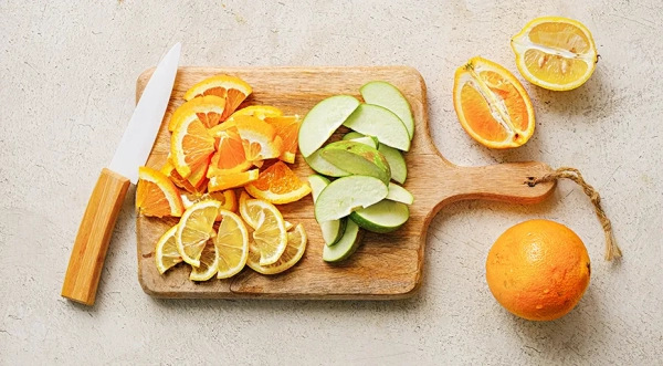 Апельсины и лимон вымойте щеткой и нарежьте ломтиками. Яблоко очистите от сердцевины, нарежьте дольками. Добавьте в сотейник, варите еще 5–7 мин на среднем огне.