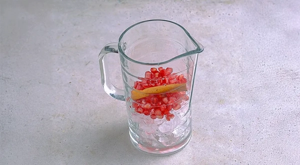 Подготовьте ингредиенты для гранатового лимонада. Гранат промойте, разрежьте, извлеките зерна. В кувшин положите лед, зерна граната и палочку корицы.
