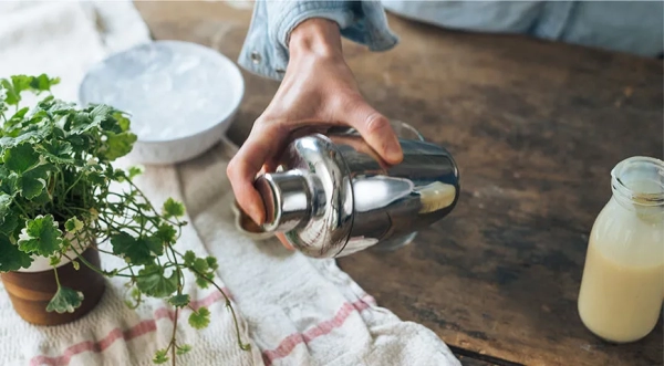 Добавьте кубики пищевого льда. Накройте шейкер крышкой и энергично встряхивайте в течение двух минут. Далее перелейте получившийся напиток в стакан, наполненный льдом.