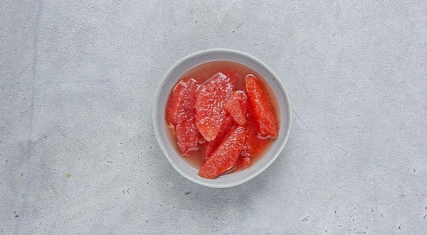 Подготовьте ингредиенты для смузи из грейпфрута и ананаса. Разделите грейпфрут на дольки, очистите от пленок (сохраните выделившийся сок).