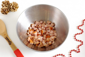 Буженину нарежьте мелкими кубиками и переложите в глубокую миску.