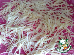Начнем с картошки. Чистим, моем, трем на корейской терке. Хорошо промываем в дуршлаге, сушим на кухонном полотенце.
