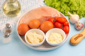 Подготовьте указанные продукты. Куриные яйца отварите заранее в течение 12 минут и резко охладите в ледяной воде.
