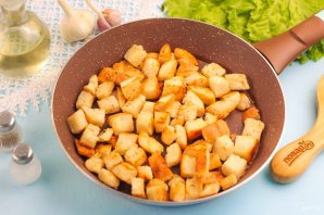 Нарежьте ломтики хлеба кубиками и спрессуйте в них очищенные зубчики чеснока, перемешайте. Обжарьте нарезку хлеба на сухой сковороде примерно 3-5 минут до румяности, не забывая ее помешивать.