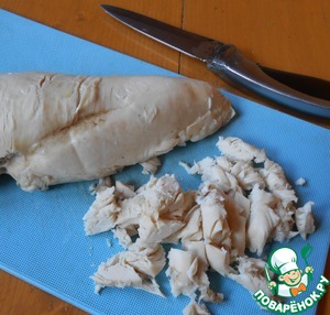 Куриное филе отварить, остудить, нарезать.