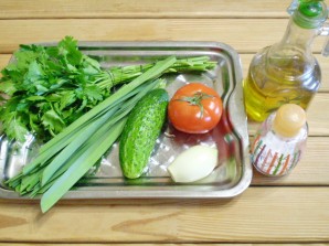 Сочетание свежих помидоров, огурцов, лука и большого количества зелени подчеркнет вкус приготовленного на огне мяса. Приветствуется разнообразие зелени — такой, как кинза, укроп, петрушка, зеленый лук перо, листья молодого чеснока, черемша и т.д.